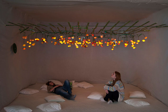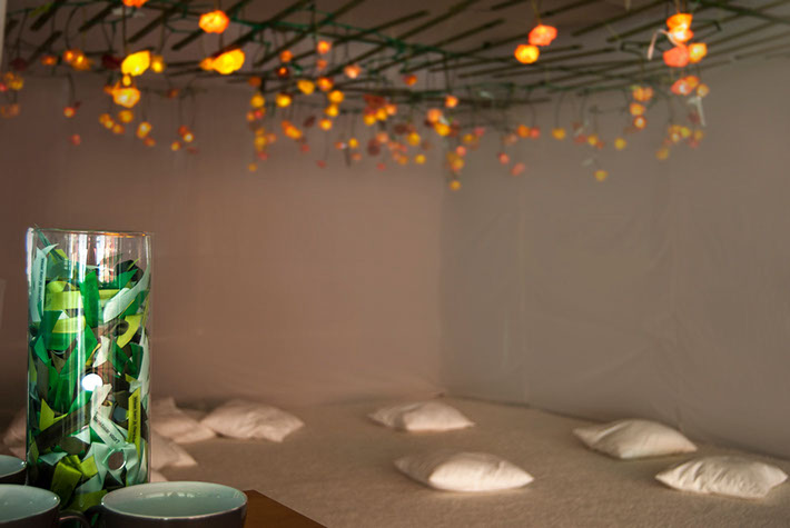 Starting with a research to all different forms, causes and experiences of happiness, Marianne Krist and Sarah Reichenbach have developed and interactive installation. Working with natural shape, light, movement, touch, scent, taste and sound, the artists have created a full interactive experience to trigger all the senses of the visitor.