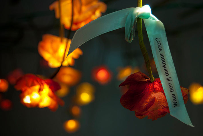 Ribbons with little mirrors presented in a glass jar state the question: "Waar ben je dankbaar voor?" (What are you grateful for?). Visitors may hang those ribbons inside and contribute to the creation, or take them home as a reminder.