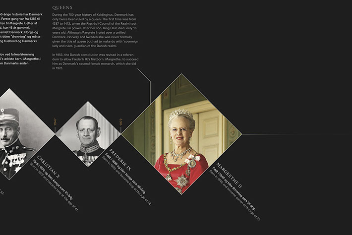 The image on the left shows the representation of the Danish Royal Bloodline. It starts from 1268, the year Koldinghus was build, until 750 years later, 2018.