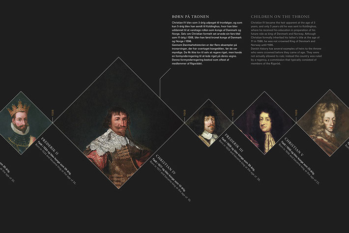 The image on the left shows the representation of the Danish Royal Bloodline. It starts from 1268, the year Koldinghus was build, until 750 years later, 2018.